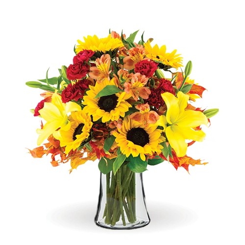 A burst of autumn joy that dances in warm golds, deep reds, and vibrant oranges. Sunflowers, yellow Asiatic lilies, red carnations, and orange alstroemeria come together with lush oak leaves and ruscus to craft a radiant, heartwarming display. Perfect for adding seasonal cheer to your table, gifting to brighten someone’s day, or enhancing every cozy corner of the home.